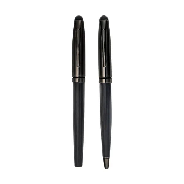 Exude elegance and professionalism with our premium Black Metal Pen Set featuring a luxurious combination of matte and glossy finishes. This executive set includes one Roller Pen with cap and one Ball Pen with twist mechanism, both crafted from durable metal and filled with smooth-flowing blue German ink. Designed for style and comfort, the set is ideal for corporate gifting, branding, and executive promotions. Presented in a sleek black PU leather box with a soft velvet interior, it delivers a perfect blend of sophistication and functionality.