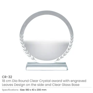 - Design: Elegant round clear crystal award with engraved leaf detailing